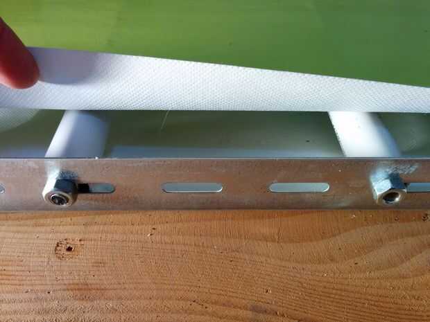 La rigidez de la cinta viene de las barras de acero, además de por lo menos 2 longitudes de varilla de 8 mm de rosca que pasan por el centro de los tubos. Para longitudes más largas, más piezas de varilla roscada aumentaría la rigidez. Utiliza varilla roscada en los dos extremos: 1 por el rodillo que actúa como un tensor de correa y 1 por el rodillo de la impulsión.