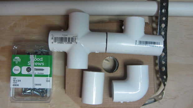 La magia (o debería decir suerte) del sistema es que al final del extremo de un mango rodillo pintura plástica barata encaja muy bien dentro de un conector de tubería de PVC de 3/4". La armadura del rodillo de pintura es lo suficientemente rígida para sostener una moderada longitud de lona bastante tenso. He intentado instalar 9" y 7" Marcos de rodillo de pintura barata de 3 diferentes Ferreterías en varios conectores de PVC 3/4" y encajan bien. Pensé que si eran un poco demasiado grandes, podría ampliarse el conector, o si eran un poco demasiado pequeñas, cinta podría ser utilizada como una cuña. Todos los conectores en esta sección son slip (es decir, no roscado).
