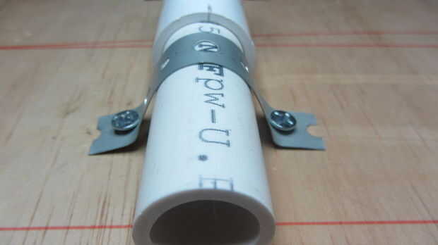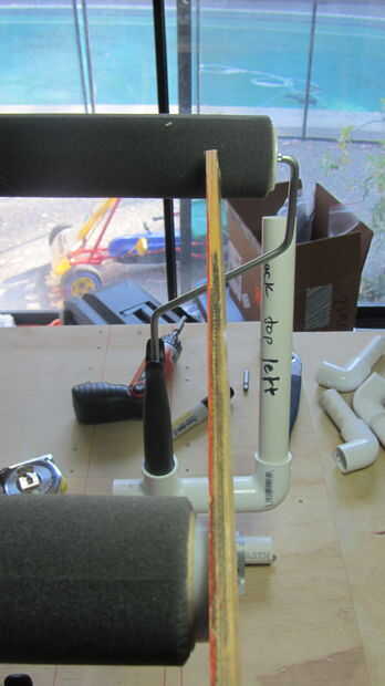 Esto es para el rodillo más corto. Es el rodillo que se ruedan cosas de. Monte a la madera contrachapada con la correa de suspensión y tornillos de madera de unos 4 1/4" desde el borde y en el centro de la región 4". Cuando monte abajo, coloque la correa que cuelga en el centro de la longitud de PVC. Esto proporciona espacio para deslizar el pie hacia adelante y hacia atrás cuando se trata a afinar la alineación del rodillo. Además, montar la correa sobre el tubo para que tenga una buena mordida hacia abajo en el tubo. Esto evitará que los pies girando innecesariamente.