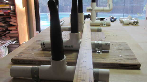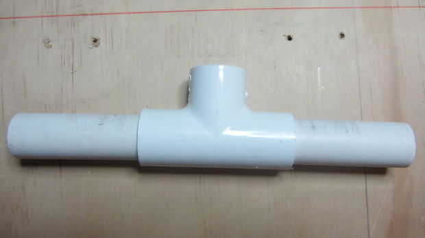 Corte 8 x 3" de longitud de tubería de PVC de 3/4". Construir 4 x pies: 3"+ t + 3". Al construir estos pies, realmente empujar, incluso del martillo en el tubo en el conector. Puede pegar pero no lo hice porque quiero usar el tee para otro día.