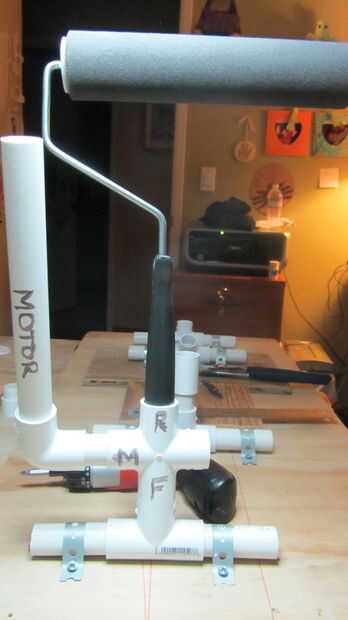Poner A en la salida del pie. Poner la Cruz en A. Poner B en un conector horizontal. Puesto 90 grados en B. Poner C en 90 grados. Poner 9" rodillo en marco. Colocar el marco en la cruz que la varilla del marco es más cercana a C. Realmente empuje hacia abajo el mango en el conector. Use cinta de conducto o algo alrededor de la manija si no hay suficiente mordida. Debe ser muy difícil (no imposible) hacer girar la manija en el conector. También, no doblar la varilla del marco.