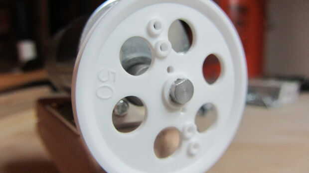 El agujero en la polea es menor que el diámetro del eje del motor. Utilice un cuchillo X-acto para ampliar el orificio apenas grande bastante para que la polea es un ajuste muy apretado en el eje.