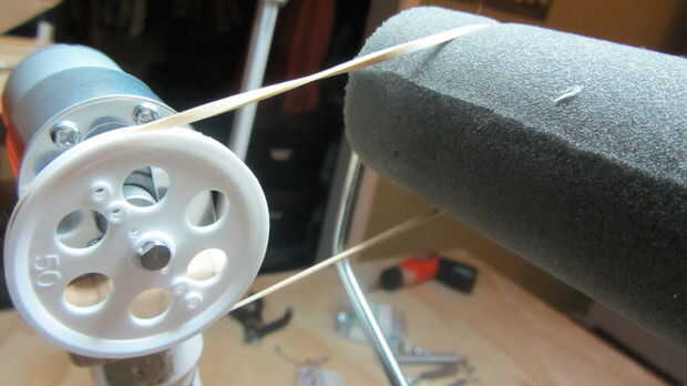 Acople el conector en el soporte a la tubería vertical. Coloque una banda de goma en la polea y el rodillo. Tienen suficiente tensión en la banda, tire hacia atrás de la pipa del PVC del motor, o reemplazar la banda por uno que sea menos elástica y más pequeños. No debe estar super apretada sobre el rodillo, pero tiene que tener un poco mordida.