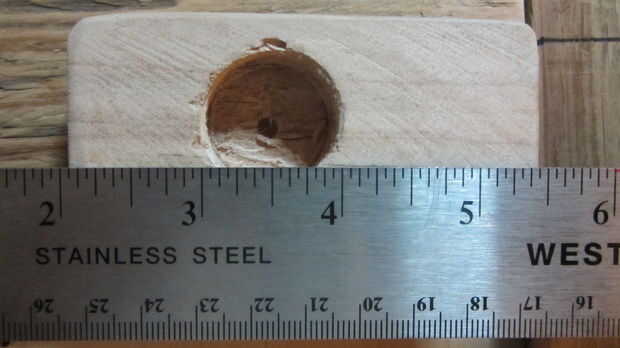 Taladrar un orificio de 1" a 1/2" en un bloque de madera que es 3 1/2 "x 1 1/2" x 3/4 ". Utilizar una pieza Forstner o algo para crear un agujero de fondo plano. Centre el agujero en el eje corto y desviarlo de 3/8" a lo largo del eje.
