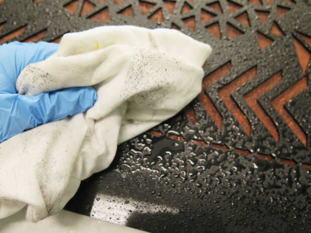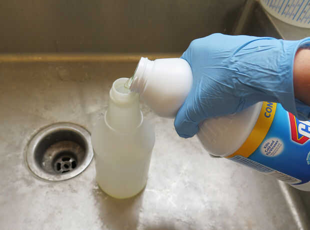 En un área bien ventilada, usar guantes y mezcle una solución de lejía de 50: 50 y agua en una botella de spray.