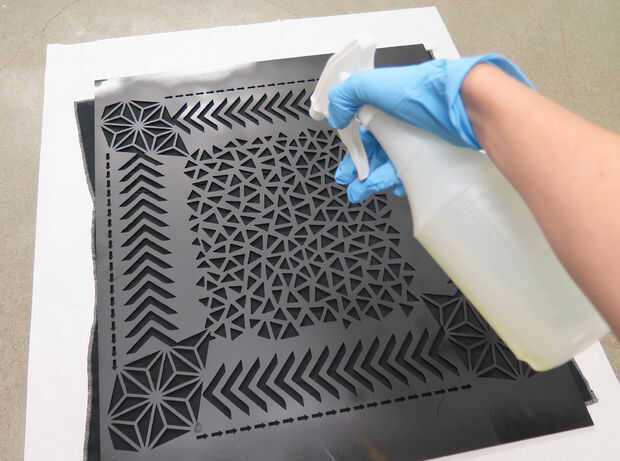 Ligeramente la niebla la plantilla con la mezcla de lejía. No rocíe demasiado, conseguir la tela demasiado saturada de líquido causará el blanqueador sangrar y distorsionar la impresión. Puede que necesite limpiar ocasionalmente extra blanqueador en la superficie de la plantilla para no gotear sobre la tela.