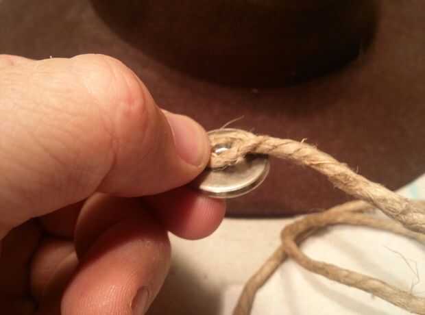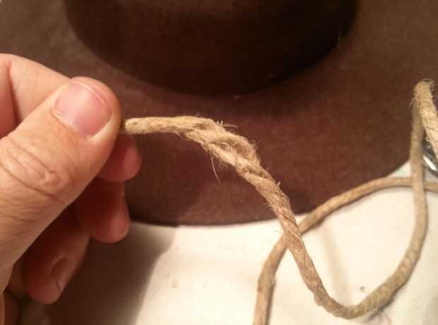 Primer paso es medir tus piezas de cáñamo. El cáñamo más grande se puede envolver alrededor de la sección del sombrero donde irá la banda de sombrero. Deja cerca de seis pulgadas de la cola en ambos lados, esto le dará una pequeña sala de meneo cuando termine la banda. Una vez que tengas la longitud del cáñamo más grande corta dos piezas más del cáñamo más grande a la misma longitud.