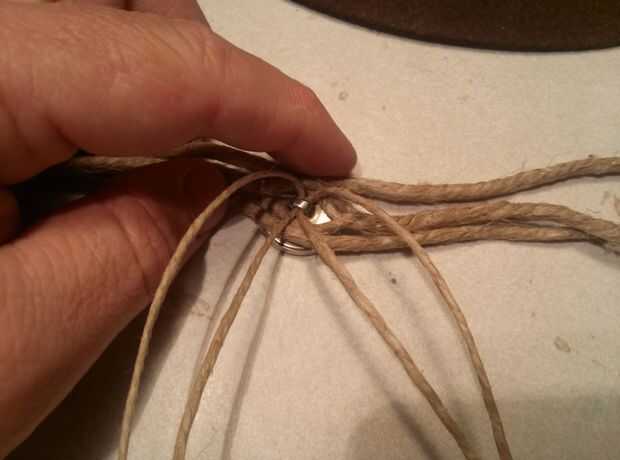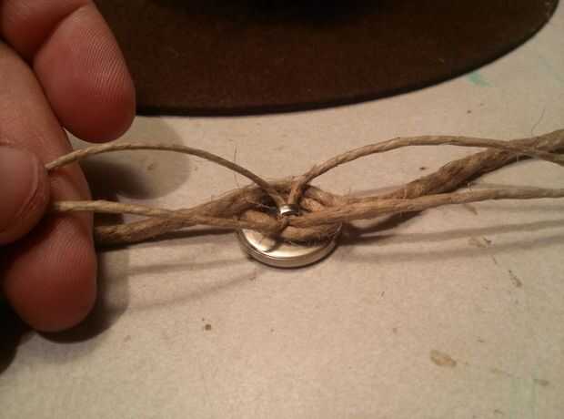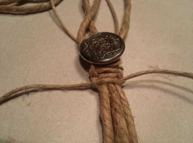 Ahora pone el extra dos pedazos grandes de cáñamo que se corta en línea y a cada lado de la pieza con el botón. Ahora puedes voltear tu banda y empezar a anudar.