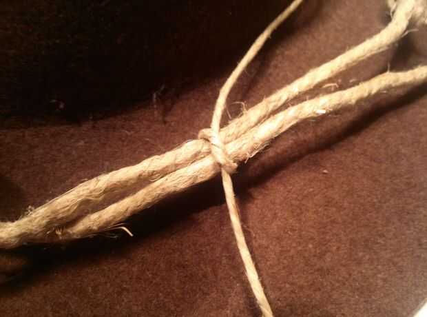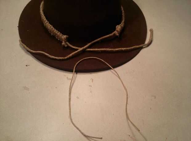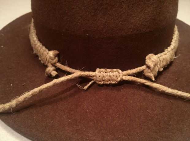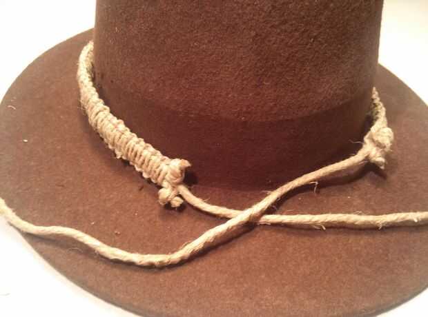 Colocar su banda en el sombrero para tener una idea de donde tendrá que colocar sus lazos finales. Una pieza de un pequeño tamaño cáñamo tal vez un pedazo alrededor de 10 pulgadas o así puede ser utilizado. Primer nudo es un nudo cuadrado seguido de unos 5 o 6 cobra puntos y empatado con un par de nudos cuadrados en la parte inferior para terminar. Esto permitirá que la banda de sombrero ajustable y apretado a la posición deseada. Los nudos de acabado así como la banda puede ser pegada para sostiene mejor la tela y posición sin embargo en la fabricación el Instructable opté por una solución menos permanente.
