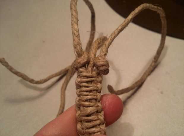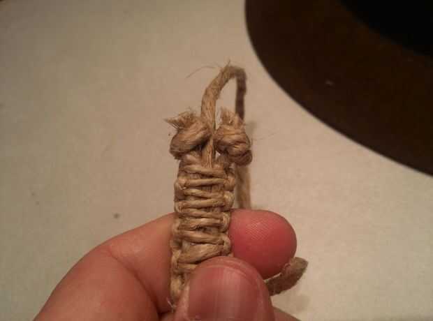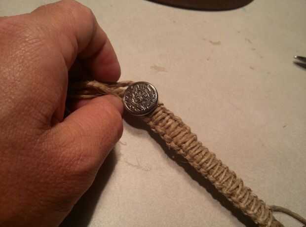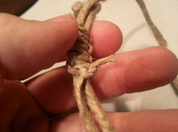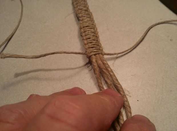 Una vez que tenga la longitud deseada de la costura usted puede atar un par de nudos cuadrados espalda con espalda en la parte inferior de la banda. Tomé los dos corredores de cáñamo más grandes exterior y atado de nudos cuadrado al ras con el extremo del nudo ejecutar luego cortadas las colas dejando sólo la cuerda más grande del centro.