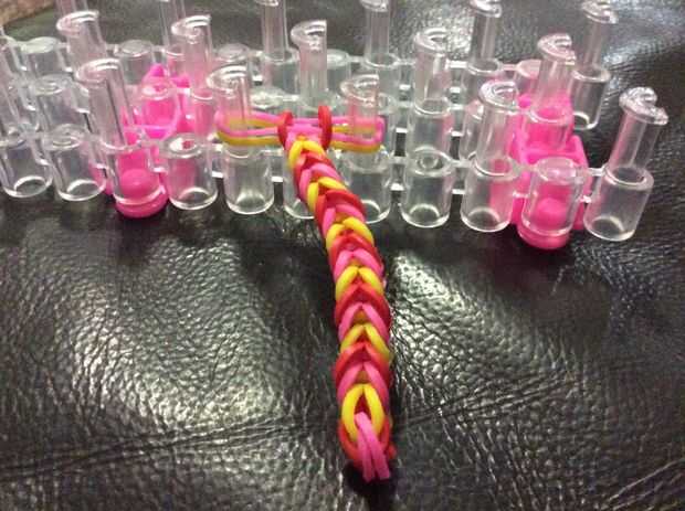 Esto es una pulsera de telar fácil que se hace en un telar del arco iris.Esto podría ser el patrón de escalera pero no agregue bandas en la fila media peg. Este es mi primer tutorial en un telar del arco iris.Mi último tutorial: (Espina de pescado)Co