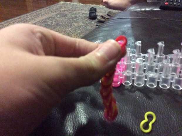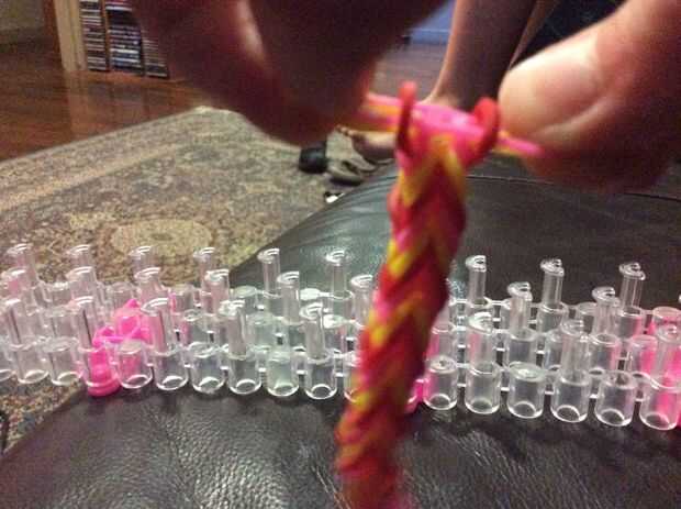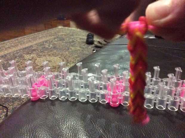 Gobierno-Gobierno es tu pulsera debe como cuando listo.Paso 1: Lo que usted necesitaUsted necesita un telar, bandas y un gancho.Paso 2: Empezando Hacer una figura de 8 con una banda y ponerlo en las 2 clavijas. Entonces puso dos bandas más en eso. po