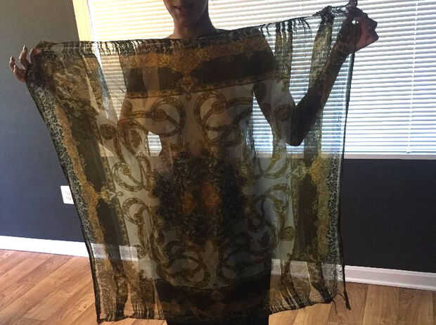 Elegir un pañuelo de su elección! Asegúrese de que la bufanda es de un tamaño apropiado que se ajuste alrededor de su busto. Por suerte muchas bufandas son una talla para todos.