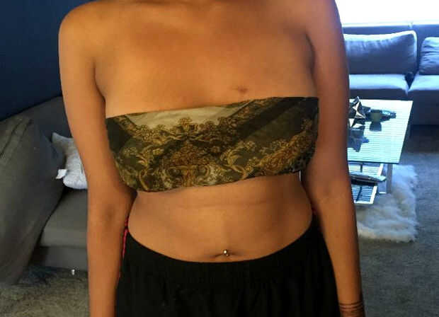 Este bikini bandeau auto alineado es super sencillo de hacer. Se hace solamente de 4 rectángulos y no utiliza a mucho la tela. Era capaz de hacer con 1/4 del medidor de cada color. Este bandeau fácilmente podría costar menos de $10, o incluso gratis,
