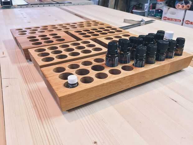 mi pareja utiliza aceites esenciales y hace sus propias mezclas.Las botellas de 20mm que usa cualquiera de sus estantes no encajan así que hice una de una vieja pata de la mesa.Ahora, esta es mi tercera.Paso 1: Lo he usado Madera, este es 125x60x60mm