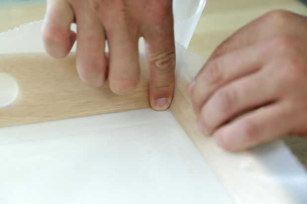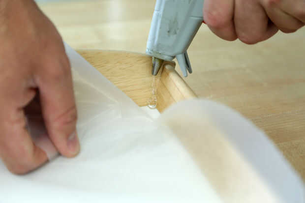 Colocación del plástico donde quería utiliza un poco de pegamento caliente en cada esquina de la bandeja y luego presiona el plástico en el pegamento, asegurándolo en lugar. Pegué el resto de las esquinas mientras tira suavemente el plástico estirado. Una vez que las esquinas se pegan abajo, pegué los bordes de la lámina de plástico en el interior de la bandeja de servir.
