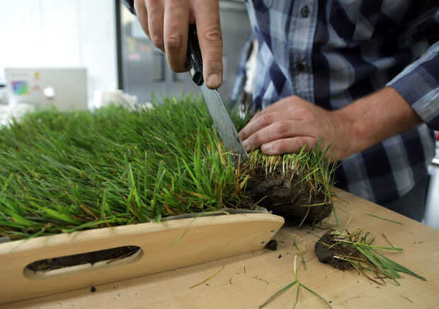 Después de que el césped se redujo a una forma áspera que fue colocado en la bandeja de la porción alineada. Entonces, el césped fue recortado para adaptarse perfectamente a la bandeja de servir.