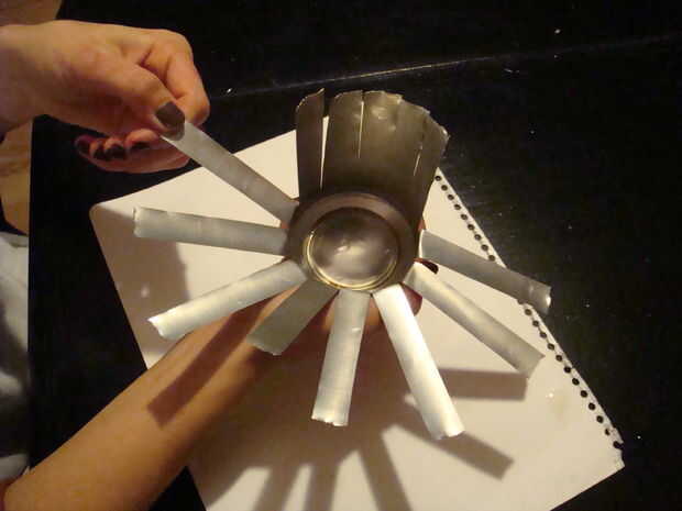 ¿Qué haces para las flores en una boda temática post apocalíptica? Se hacen fuera de latas de metal!Mi pareja y yo utiliza aluminio pop y latas de cerveza para hacer los centros de mesa para nuestra boda en un refugio antibombas. Mientras que nuestra