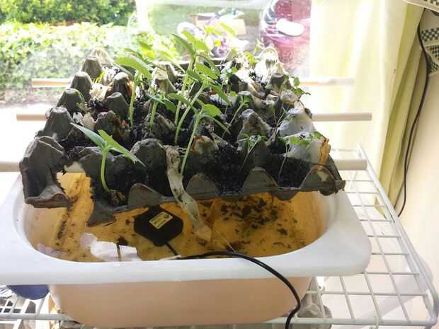 Colocó la bomba bajo el cartón de huevo para el chapoteo de la corriente de baja presión y también para ayudar a mantener el medio húmedo en todo momento.