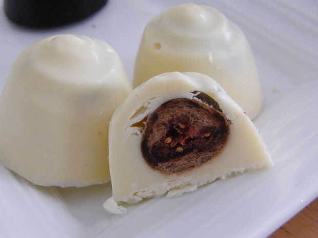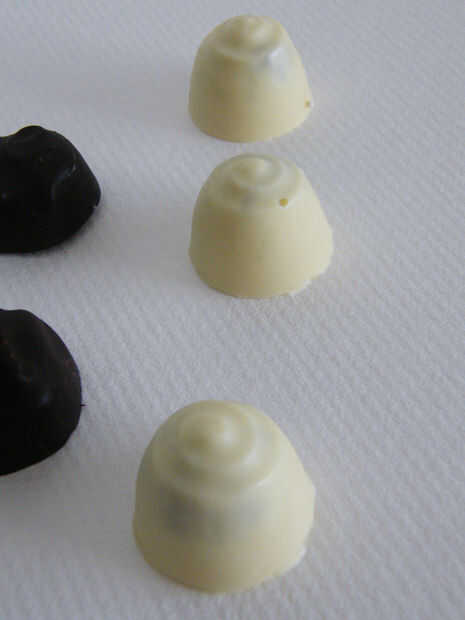 Derretir los chips de chocolate y llenar las cavidades del molde, voltee hacia abajo y toque, enfriar en el congelador durante 5 minutos