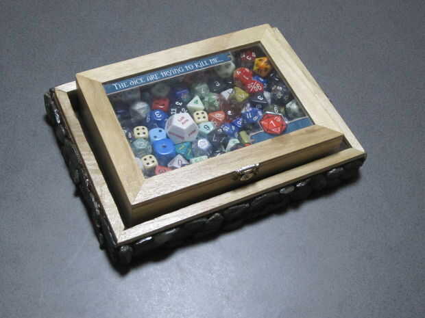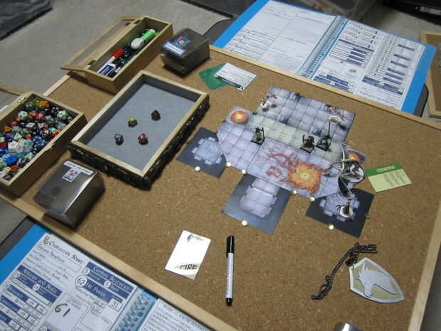 Unos meses después de completar este proyecto, comencé a fijar mis mapas (yo uso algunos azulejos de mazmorra casera y algunos publicados) a un panel de corcho para compensar la falta de espacio de tabla. Funcionó bien bastante que encontré mi pequeño dice bandeja ahora demasiado pequeño para todo el grupo a utilizar necesitaría una actualización...