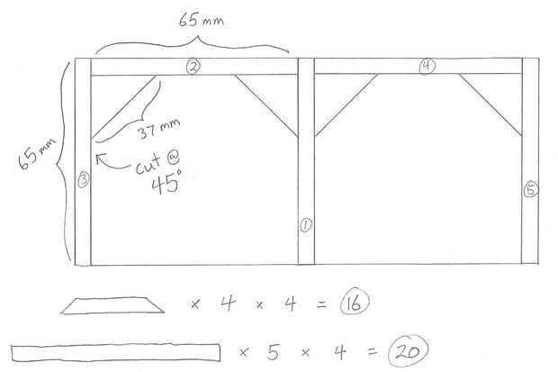 Este es un paso importante, sin embargo, porque miden el tamaño de su caja contra el grueso de los palillos (o espiga, etc.) va a utilizar la voluntad determinar cuántas "paneles" irá a cada lado de la caja. En este caso, 2 por cada lado; que requieren 5 piezas de 65mm (x 4 lados) = 20.