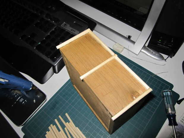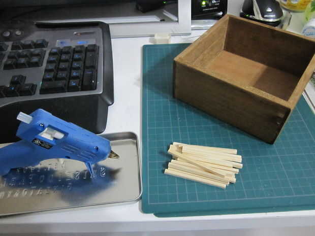 Medir y cortar los palillos (con un cuchillo afilado: tijera aplastará a los extremos) para adaptarse a cada lado de la caja.