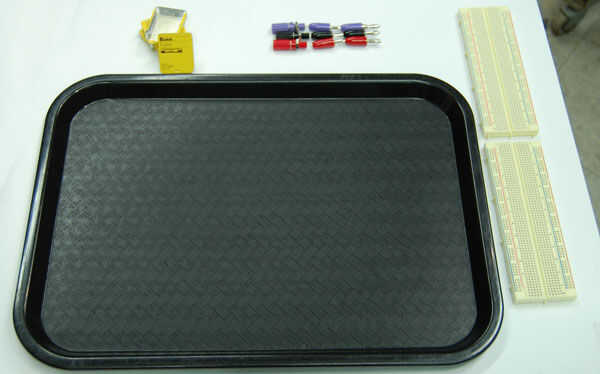 Principales componentes: conectores de tipo banana hembra, breadboards, contenedores de componentes, velcro (no fotografiado) y, por supuesto, una bandeja de comida.