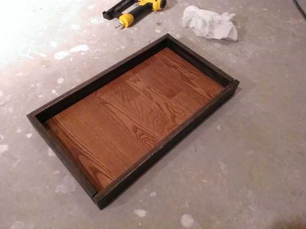 Una vez seca la mancha, os adjunto los lados en la parte inferior con pegamento para madera y una clavadora y clavos de 1,5".