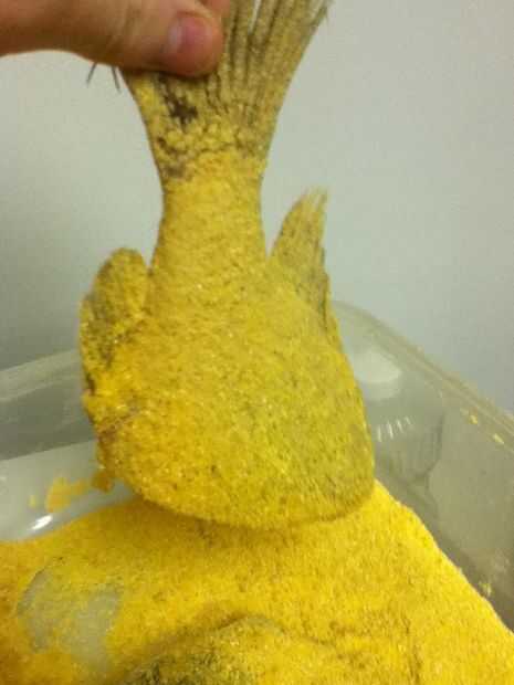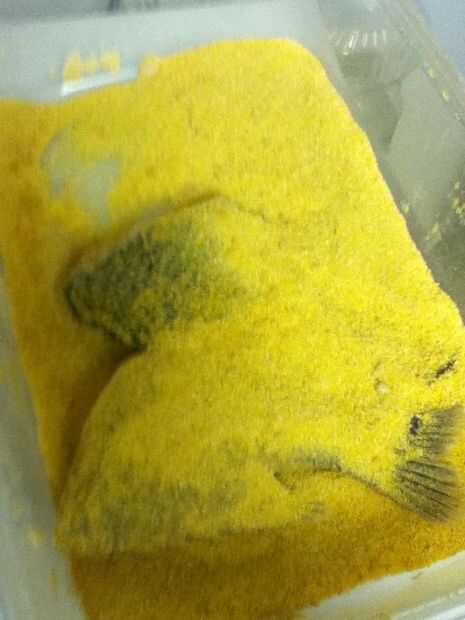 Cuando se pan el pescado va a utilizar 1/2 harina, 1/2 harina de maíz, sal y para patear un poco algunos chaceries tony. Poner en un bol grande y mezclar. Una vez puesto en el pescado y asegúrese de que usted obtener una capa uniforme a cada lado.