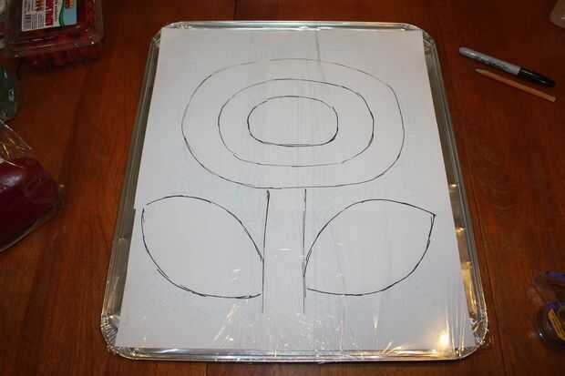 Cubrir la bandeja entera con una capa de envoltura se aferran. Podrás ver el diseño a través de la envoltura se aferran. Cinta el abrigo en su lugar para asegurarse de que no se mueva más adelante.