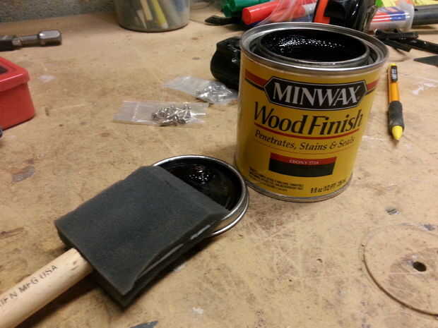 Como se aprecia en la foto utilicé manchas MinWax Guau acabado ébano para este proyecto. También tengo un pincel de espuma. Esto no es necesario, como un trapo viejo o una camiseta puede utilizar y tirar después de su uso o la mancha se ha secado en él. Asegúrese de aplicar sólo 2-3 capas de tinte para evitar la saturación de la mancha. Permite 6 horas entre capa y capa para asegurarse de que una cura completa.