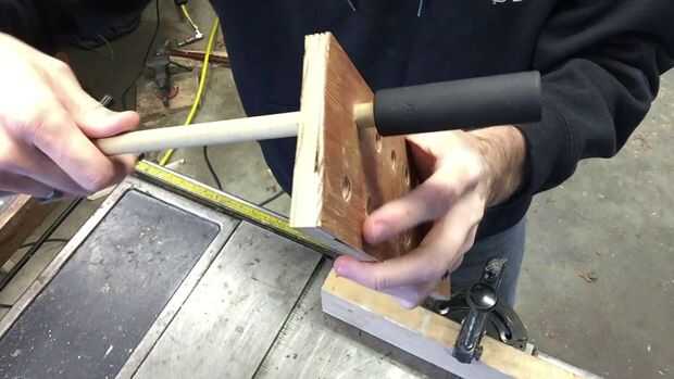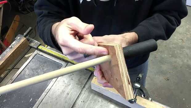 Usted tendrá que determinar cuánto tiempo desea que su clavijas que sobresalen de la superficie. Estas tomas en particular tenían un hombro que impidió que la 1/2" espiga deslizante completamente a través de la toma de corriente para que en última instancia determina cuánto tiempo tendría que cortar mis tacos. Deslice el pasador a través de un agujero recién perforado y se deslizó el cuadradillo de accionamiento de la toma sobre el pasador hasta que tocó fondo en el hombro. Luego tiró el pasador a través de la madera, que la toma con él, hasta que la toma de contacto con la madera. Marqué el pasador en la parte posterior de la madera. Este sería mi vestido.