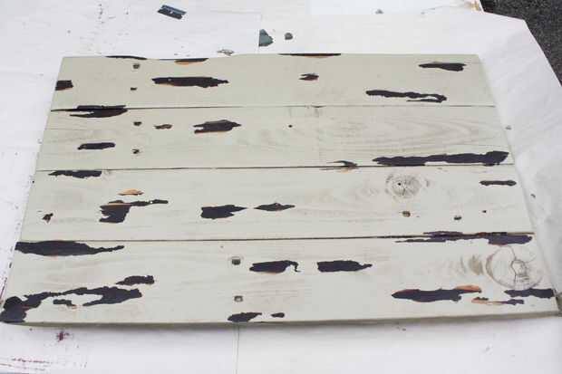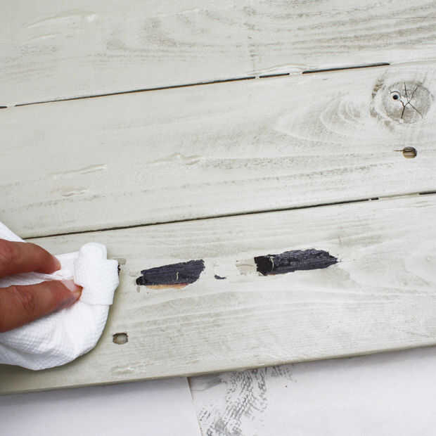 Pintar la bandeja y deje secar completamente. Puede que necesite dos o tres capas. La madera es muy porosa y absorbe mucha de la pintura. Una vez completamente seco, limpie la bandeja con la toalla de papel, la vaselina se limpie con facilidad y la mancha oscura mostrará a través de.