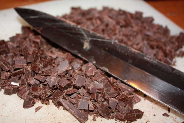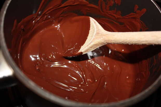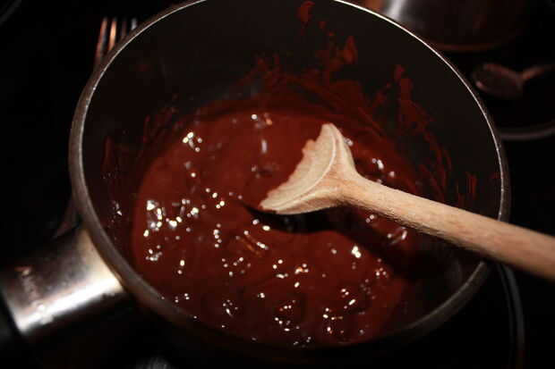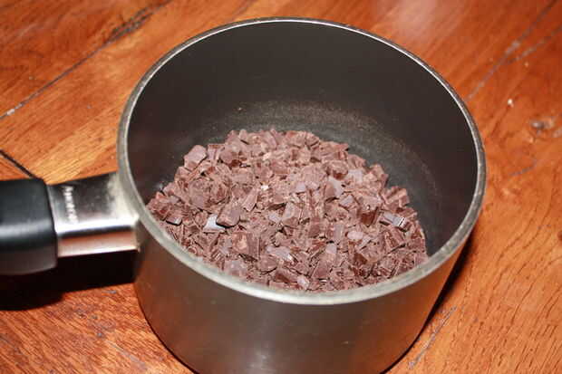 Esto es lo que el acabado chocolate parece. Después de terminar, cuchara en el bote pequeño con las manos. Ahora vamos a sustituir dos ollas para baño María (algo que no sabía existía antes). Con el chocolate en la olla pequeña, sumerja lentamente la parte inferior en el agua hirviendo en la olla más grande. Usando una espátula de goma o una cuchara de madera, mezcla el chocolate fusión durante unos 30 segundos. Luego retire del agua y revuelva más. Debe ser una mezcla de grumos y chocolate derretido. Luego lo pones de nuevo en el agua durante unos segundos y volver a retirarlo. Revolver enérgicamente hasta que quede completamente lisa.