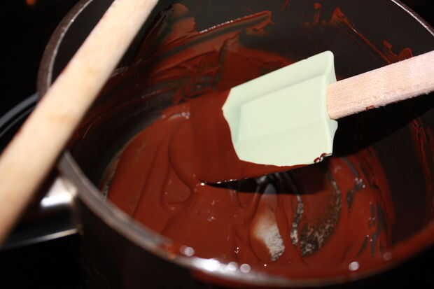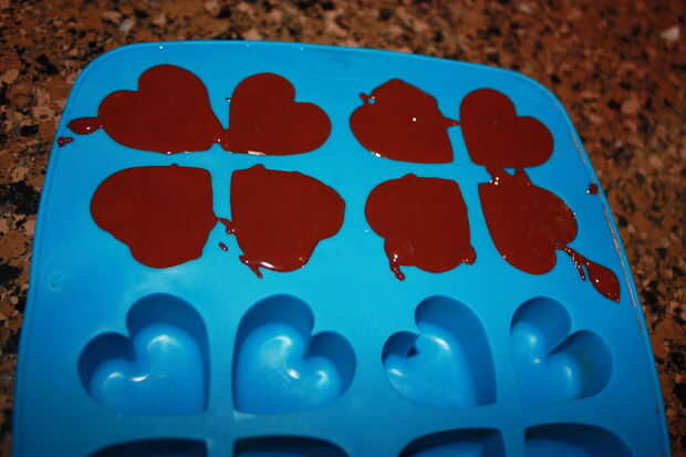 Ahora nos hemos derretido chocolate, listo para entrar en el molde de cubo de hielo. Así que el molde listo junto a la estufa, y usando la cuchara o la espátula para ayudar a, vierta el chocolate en un flujo en el molde. Usted quiere verter hasta que llegue a la parte superior del molde. Luego déjela sentarse y listo.