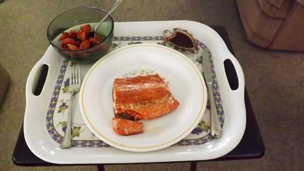 la receta (aquí, adaptado de un anuncio vino) llamado para cortar el salmón en tiras antes de asarla, pero encuentro que cocina intacto resulta en una mejor preparación y presentación. También, varios pinchos (metal o madera) facilita a los peces.Par