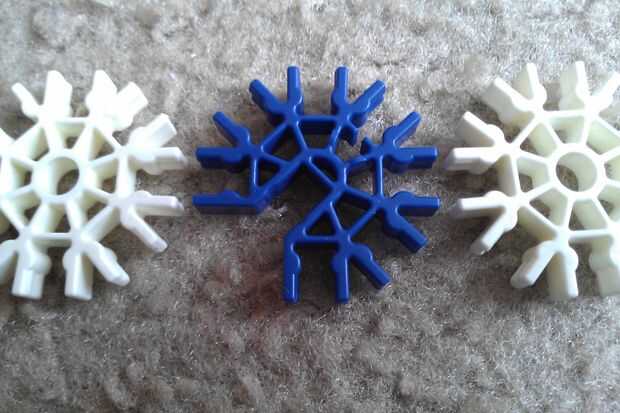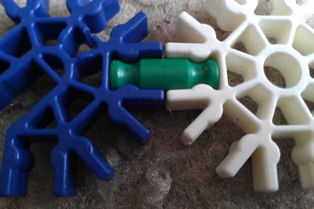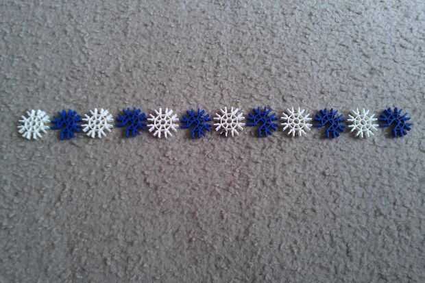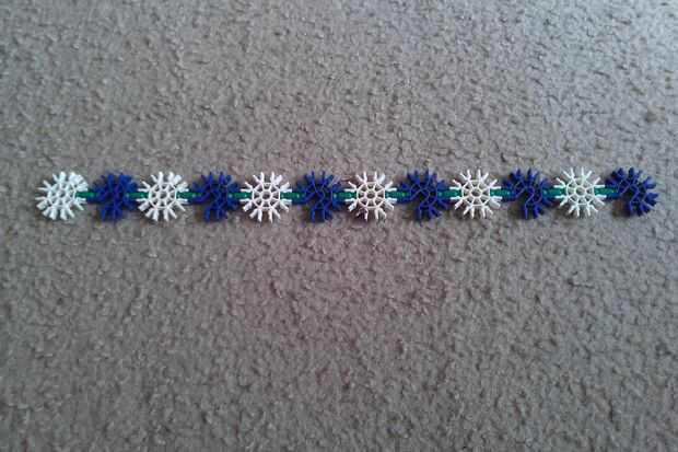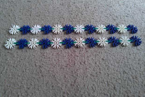 Seis conectores blancos y seis conectores azules y disponerlas como se muestra. Asegúrese de que los conectores azules enfrentan exactamente como se muestra. Conectarse mediante barras verdes. Repita el procedimiento para hacer dos filas. Estas filas deben reflejar las filas que hiciste en el paso anterior.
