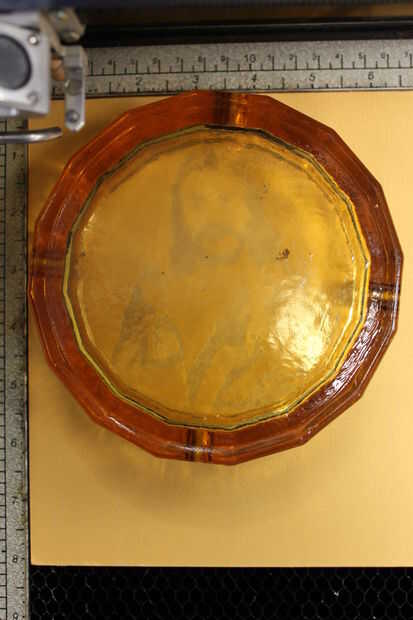 5) lugar cenicero de cristal favorito en el láser de Techshop Detroit, personalmente salí de la prueba en el láser y coloca el cenicero encima de la imagen de prueba usando como guía.