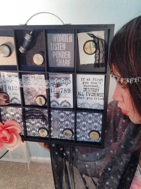Compré una bandeja de memoria, paquete de 7gypsies junque e imágenes de tapas de botella de Michaels.