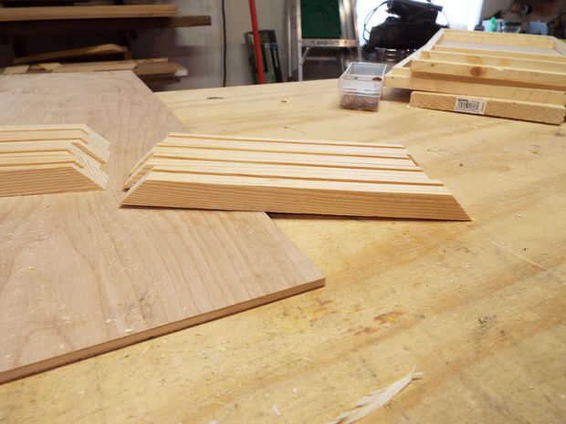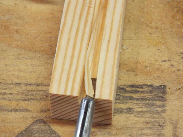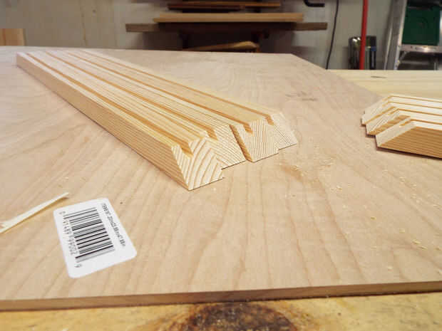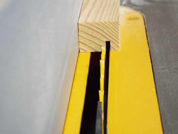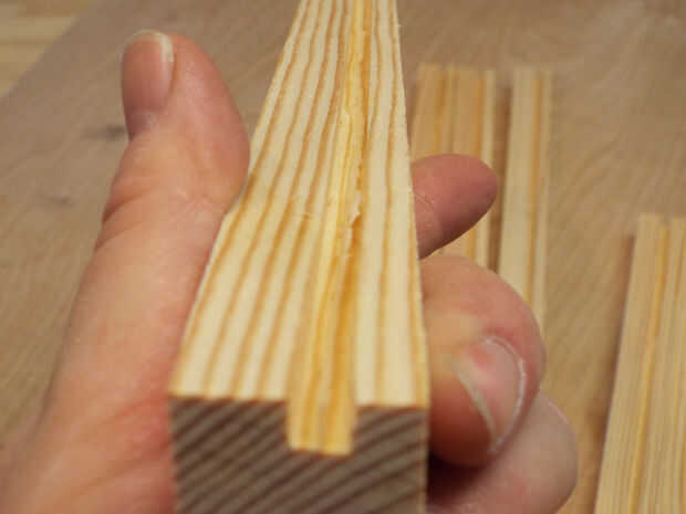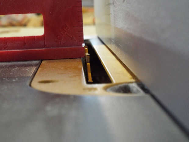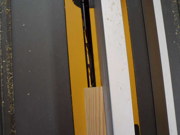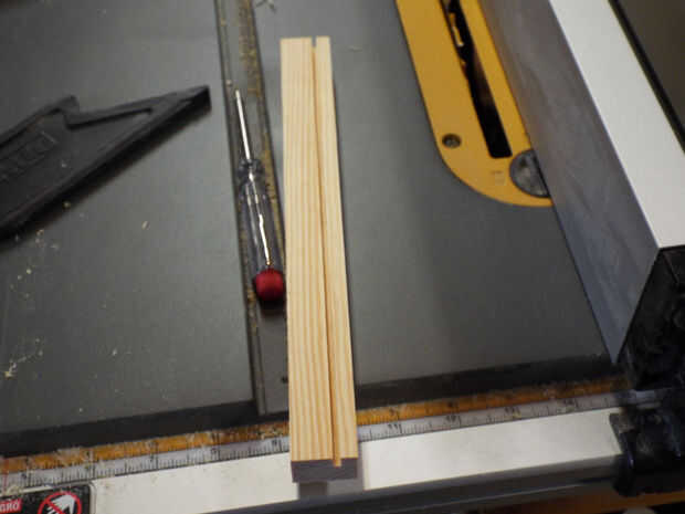 Ahora queremos cortar un rebajo en la 1 en tiras de 1/4 en el fondo. Usé mi plaza de velocidad para medir la altura de la hoja a 1/4 en, establecer mi guía a 1/4 en, luego recorrió todas las 8 tiras en el lado largo. Descubrí que por mover mi valla sobre un diente de la hoja sobre mi tiras encaja perfectamente en el roble de capas. Con la sierra, yo solo globo ocular que alinee la guía para que la hoja de sierra se ejecutará justo al lado del corte anterior. Recorren todas las 8 piezas otra vez. Asegúrese de que tener todas las piezas orientadas en la misma dirección, usted quiere allí para ser 1/4 de pulgada en la parte inferior la mitad de la tira. También si tienes un remanente fino de madera en la barbilla, utilice un pequeño destornillador cabeza plana para Limpie (no necesitadas de herramientas lujo).