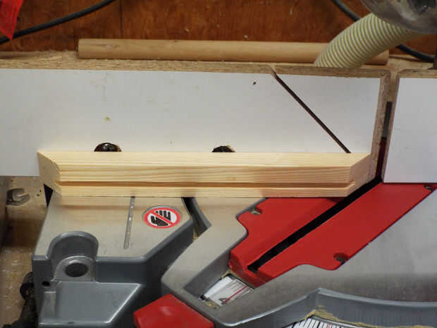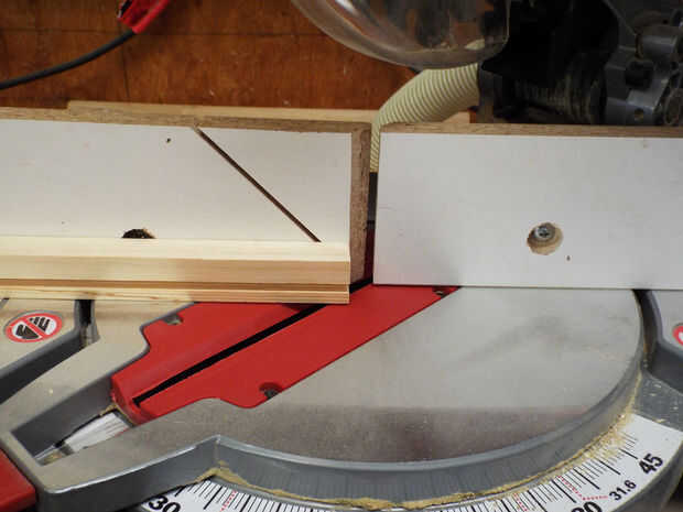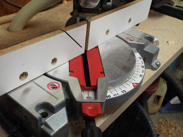 Ahora podemos cortar los ingletes de 45 grados. He utilizado mi sistema de Sierra de inglete a 45 grados. Sugiero hacer unos cortes de prueba para asegurarse de que su como cerca de 45 grados como puede ser, o las juntas de la caja será ligeramente desalineadas. También, asegúrese de cortar con la barbilla hacia fuera y corte ambos lados de la tira con el inglete hacia afuera.