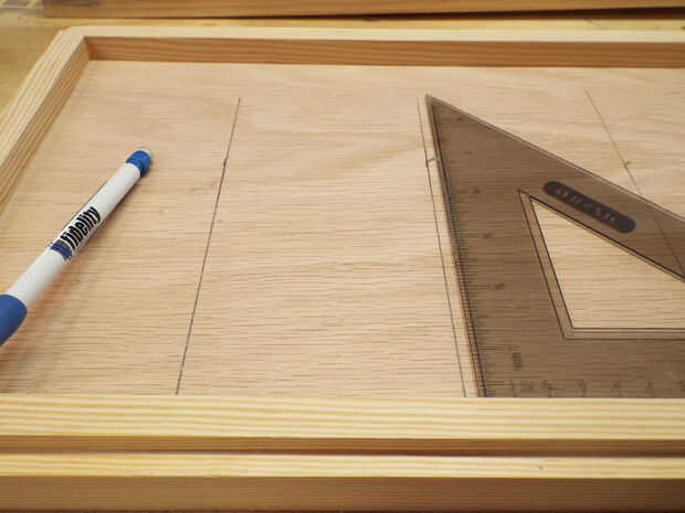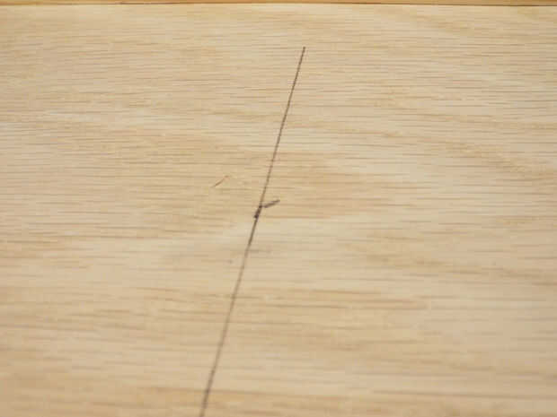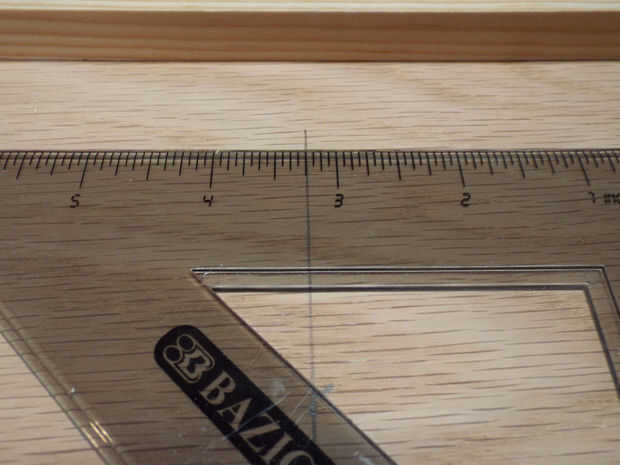 Tiempo para medir el espacio de tus separadores. Puesto que nuestros espaciadores son 1/4 en y necesitamos en 3, vamos a medir de un lado en 3 1/4, cuatro veces. A partir de la izquierda, había medida 3 1/4 en y marcó una línea a la derecha que muestra donde el espaciador necesario para ir. (ver imagen 6)
