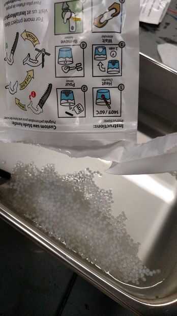 El instamorph viene en pequeñas bolitas de plástico (ver instrucciones en la parte posterior del paquete para el uso correcto) y cuando se añade a la temperatura apropiada del agua se ablanda y serán maleables. Una vez maleable puede quitar cuidadosamente la porción que usted necesita y empezar a trabajar en una forma deseada. Encontramos que varias inmersiones en el agua ayudaron a hacer las cosas bien. No siento como si tienes que tener perfecta en tu primer intento!