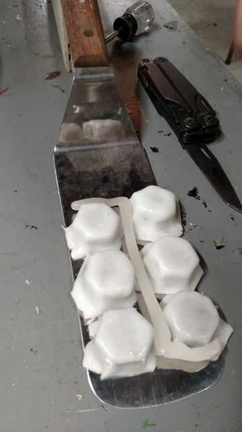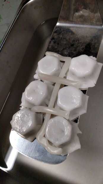 La parte difícil fue conseguir que todos a permanecer juntos cuando se sumergen. Nuestro truco fue otra vez utilizando esta espátula y cuando salió a presionar los componentes para hacer que todo funcione. Esto fue una mofa para arriba, pero idealmente inmersiones múltiples ayudará a formar correctamente. Tenga cuidado si utiliza peso para mantenerlo hacia abajo. Nos enteramos que puede formar el material en una forma indeseable.