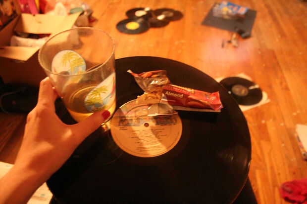 Ahora, estás listo para tus aperitivos y más en sus bandejas musical! Puede hacer un conjunto de sus viejos discos. Organizar por artista, tema o décadas. Mis cinco bandejas que he hecho encajar el tema de los 80 los iconos. Como puede ver en la foto de introducción, son los discos de vinilo que he usado...