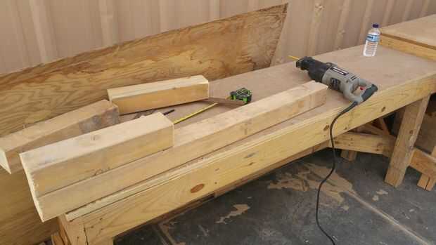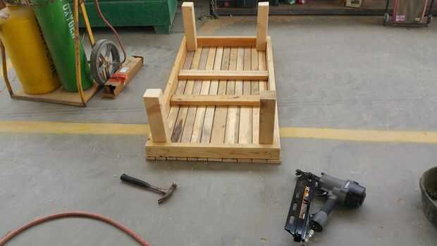 Una vez que se hacen los cortes, fije las patas a cada esquina usando los tornillos y un taladro. Use una escuadra para verificar las patas son rectas y que van a ser perpendiculares al suelo.
