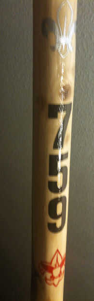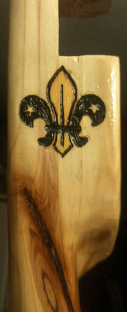 Se añadió también una muesca en la parte superior del personal para permitir que el marco de madera atracar con ella. Una vez acoplado en la muesca del este, un amarre de cuero está ligada a la estructura y la bandera está asegurada. Se puede ver la sección dentada por encima de la "Flor De Lis" en el personal.