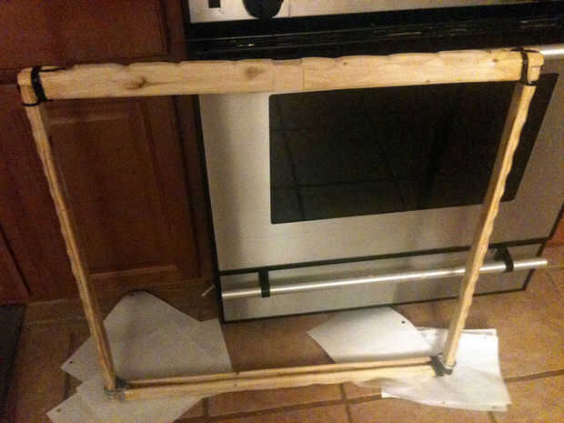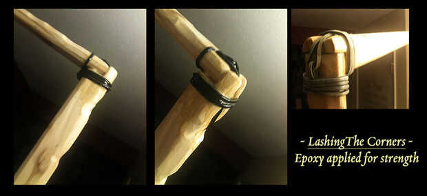 Bandera construcción del marco: Para crear la estructura de madera, utilizamos un repuesto de 2 x 4 rasgado por la mitad a lo largo de una mesa de sierra. Nosotros entonces diluirlo un poco en la anchura de la misma Sierra. Se utilizó la sierra otra vez los bordes del "surco" y crear juntas de dedos para que le mate las piezas correctamente y perfectamente cuadrado. Después de aplicar abundante pegamento de madera de alta calidad, nos azotó junto con cordón de cuero y el paracaídas. Una capa saludable de epoxy de alta resistencia en las esquinas de había terminado el trabajo. Más tarde fuimos y poner sangrías y "nicks" en el marco (muestra). Estas muescas permiten la cuerda de paracaídas y tiras de cuero para agarrar el marco para un ajuste apretado y ajustado sin deslizarse. estas marcas también dan la bandera más "ritmo visual".