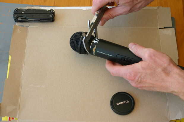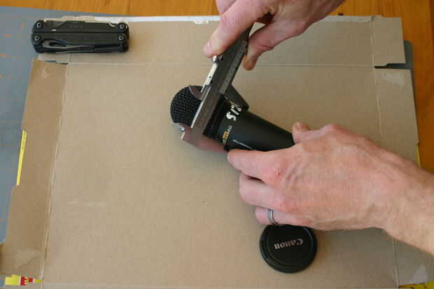 El micrófono va a determinar algunas de sus dimensiones.  Fue querer un cubo, pero terminó yendo con una caja más corta que ancha para que no llegar en el camino el interruptor on/off.  Mida el diámetro del micrófono en la parte superior e inferior de donde se instalará su bandera.  Quería que mi bandera empresa y llevará a cabo en lugar por la rejilla que los tornillos en la parte superior, por lo que mide en los hilos debajo de la parrilla.  Un método alternativo sería obtener las dimensiones de su micrófono y utilizar el aislamiento de la pipa dentro de la caja de la bandera para hacerlo deslizar y apagar.  Este método no es tan estrecha, pero es útil si vas a querer usar la bandera en diferentes micrófonos.